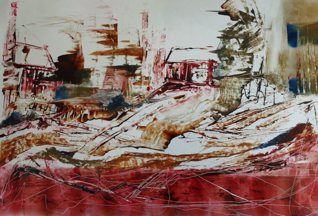 Home Please click on images to enlarge Pratande Lander, High Coast, Sweden, Monoprint, Intaglio etching ink on fine Indonesian paper, approx 59.4 x 84.1 cm 2025